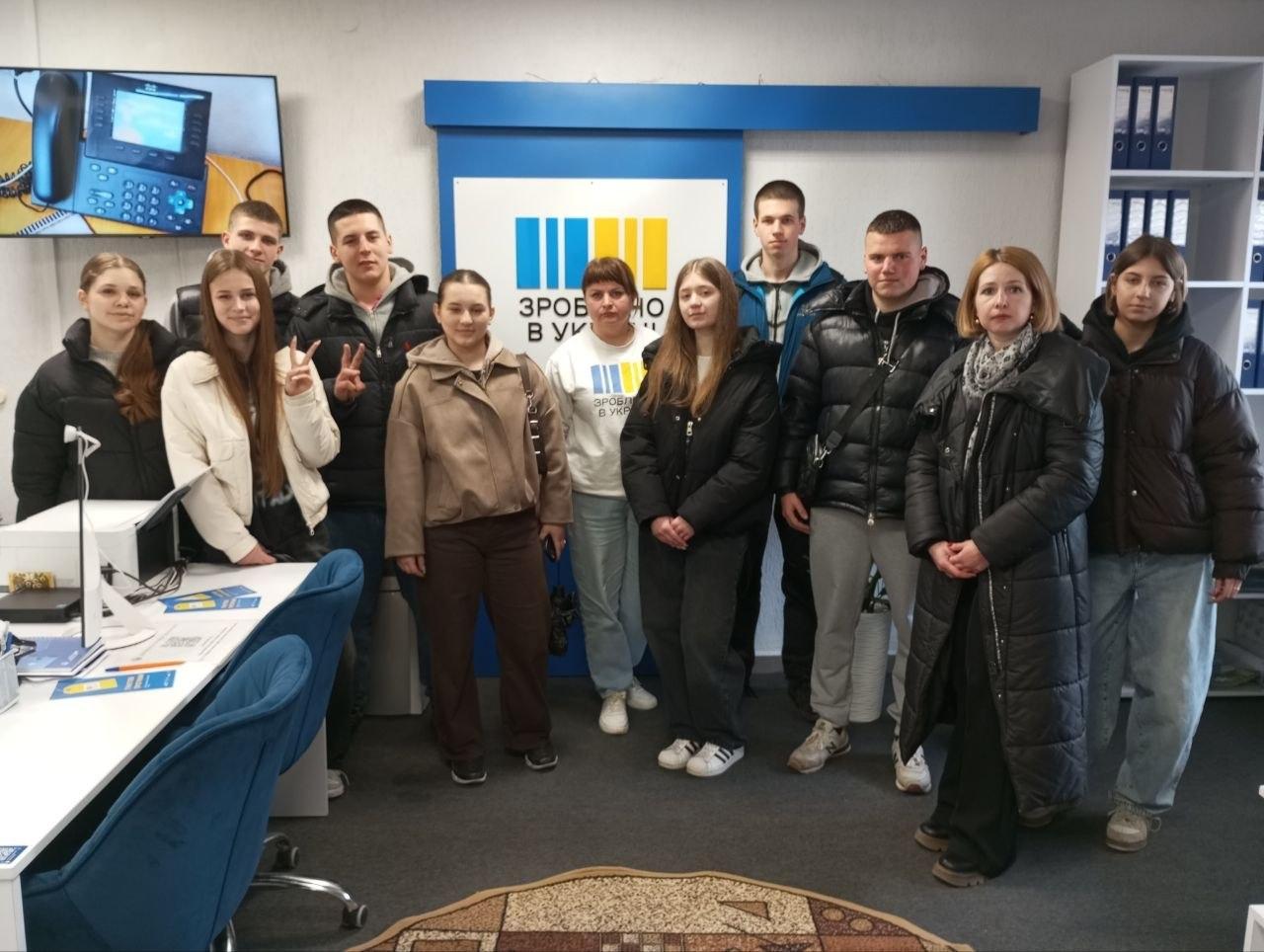 Начальник відділу надання послуг роботодавцям Леся ПІХО провела до сучасного офісного простору, оформлений в концепції “Зроблено в Україні”. Студенти дізнались про його діяльність: підтримка бізнесу, надання консультацій, грантів та держпрограм.