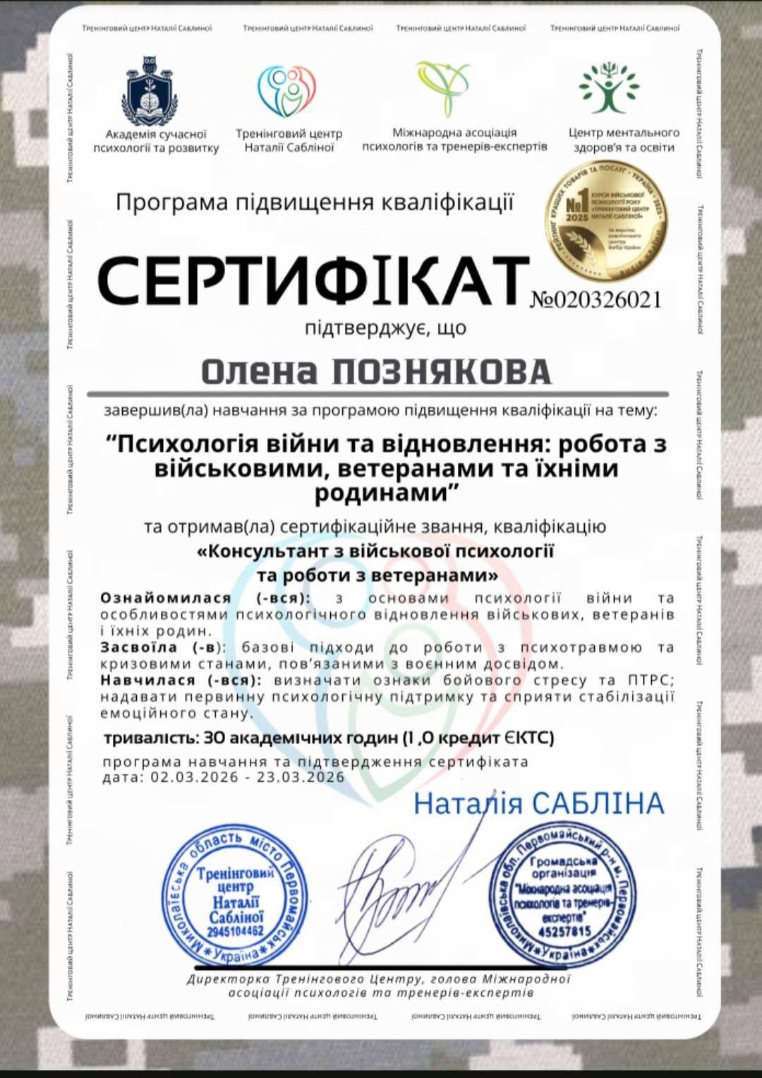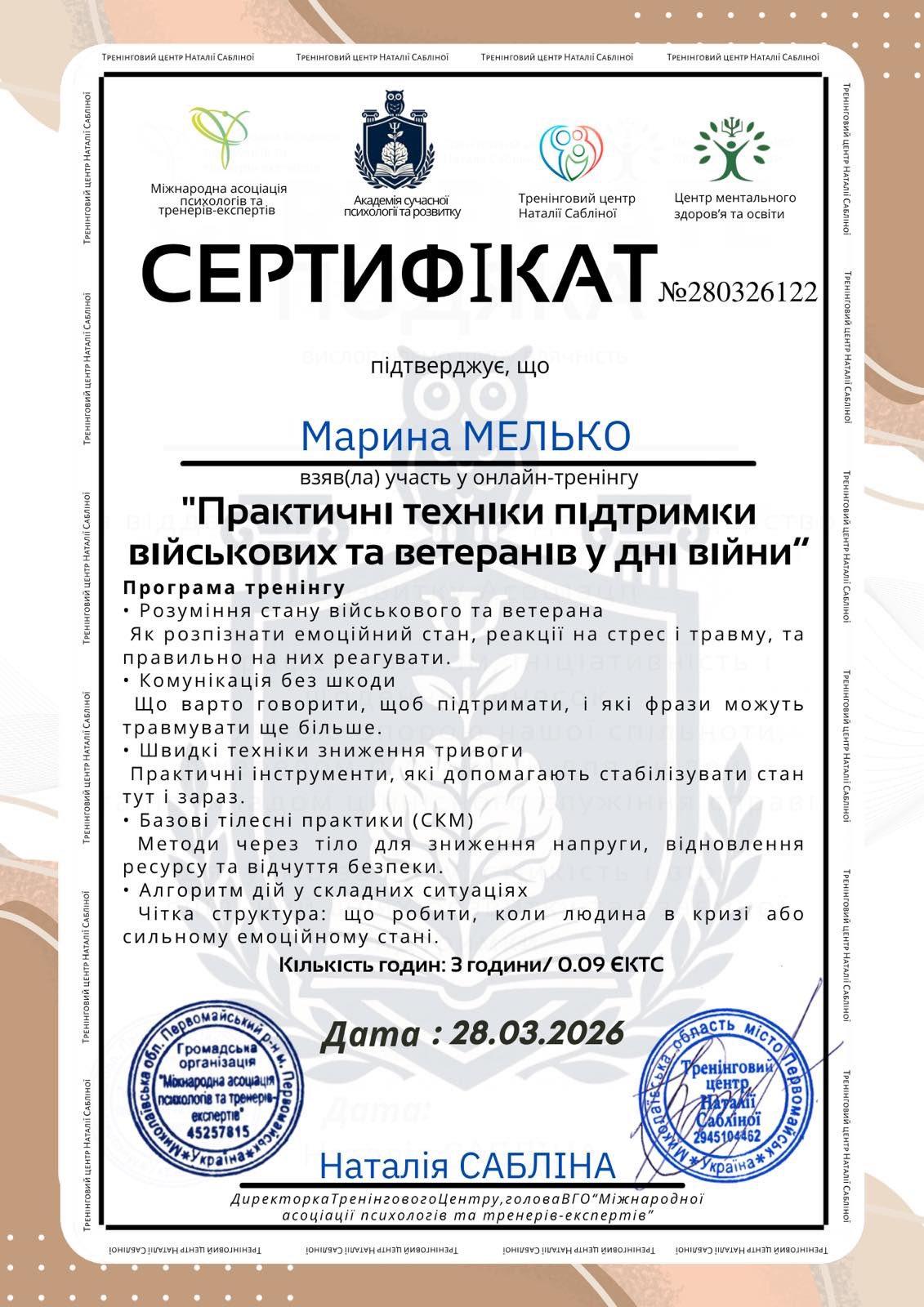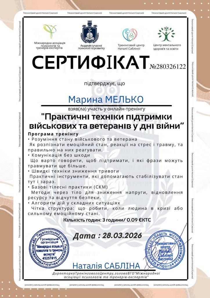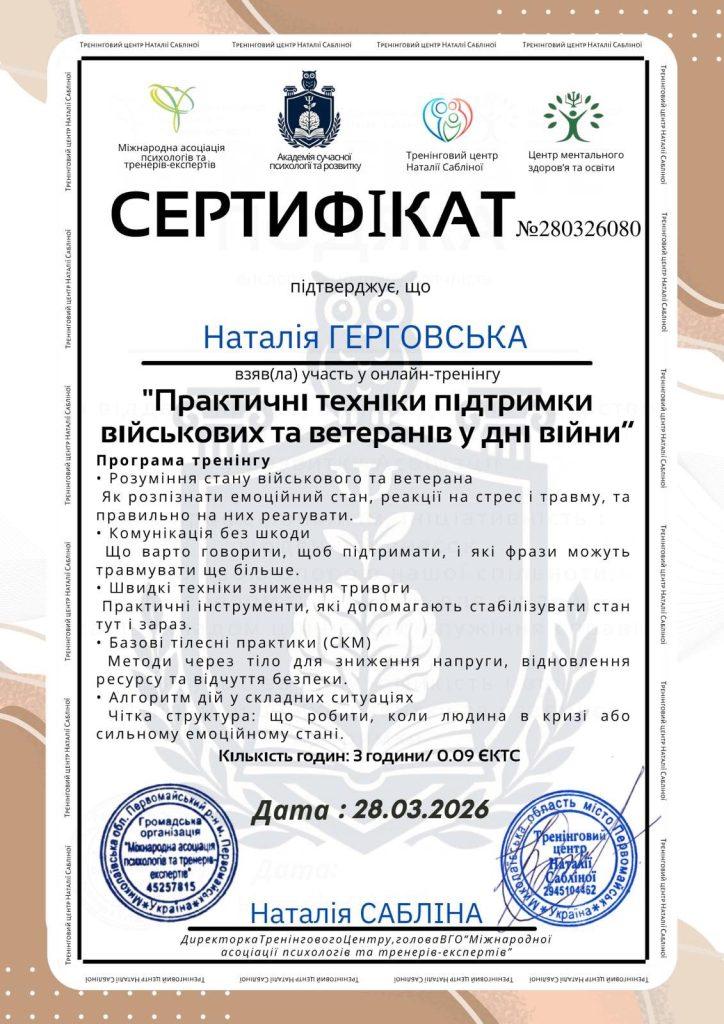 Успішно завершено навчання на тренінгу «Від розгубленості до впевнених дій: практичні техніки підтримки військових та ветеранів», організованому Міжнародною асоціацією психологів, Академією сучасної психології та Тренінговим центром Наталії Сабліної.